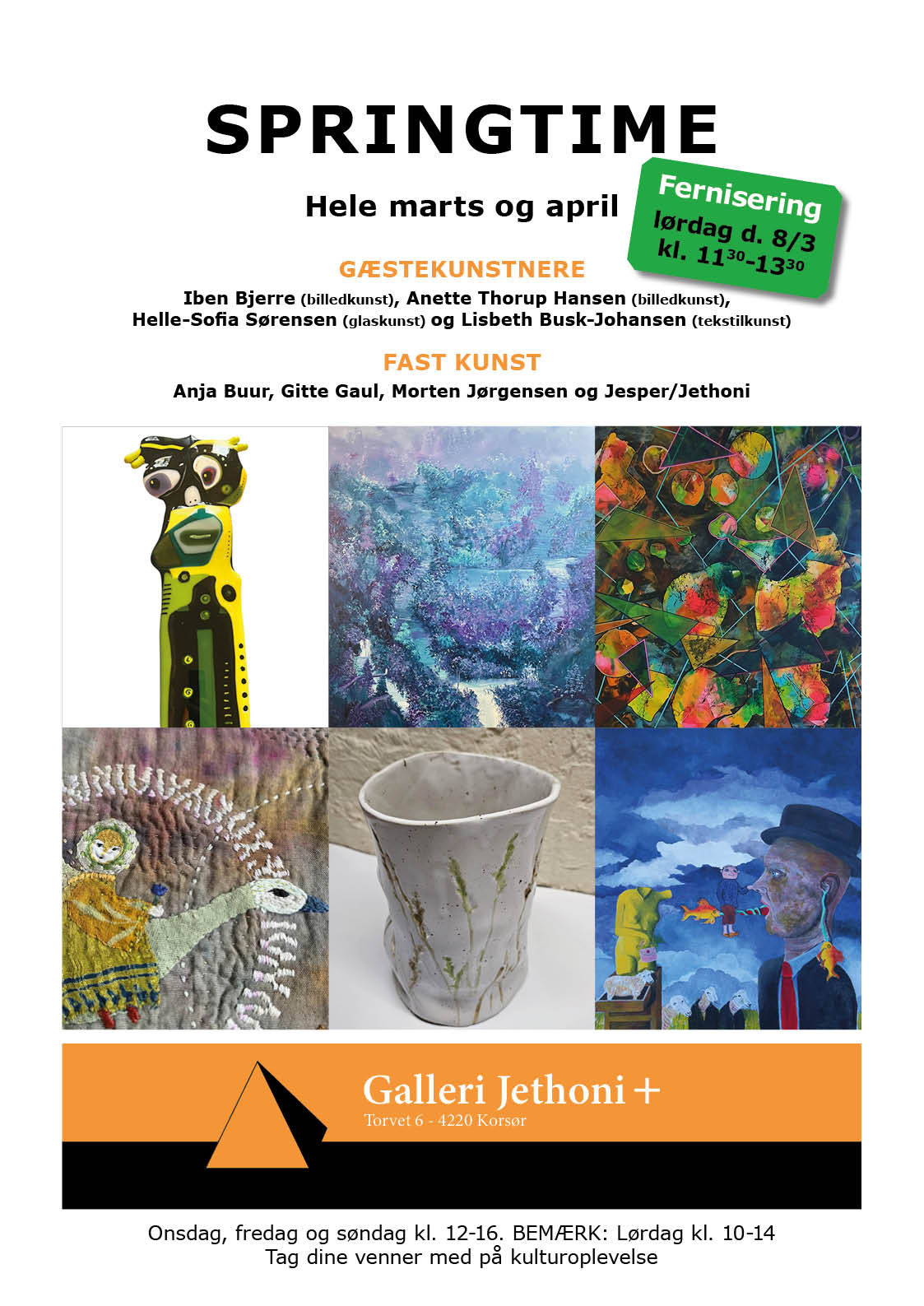 SPRINGTIME fernisering foregår den 8. marts kl. 11:30 – 13:30 - med tre nye spændende gæstekunstnere, Helle-Sofia glas, der har forlænget. Hertil de fire faste kunstnere Gitte Gaul, multikunstner, Morten Jørgensen, billedkunst, Anja Buur, keramik og Jesper Th./Jethoni, pyramidekunst – og med bog derom.