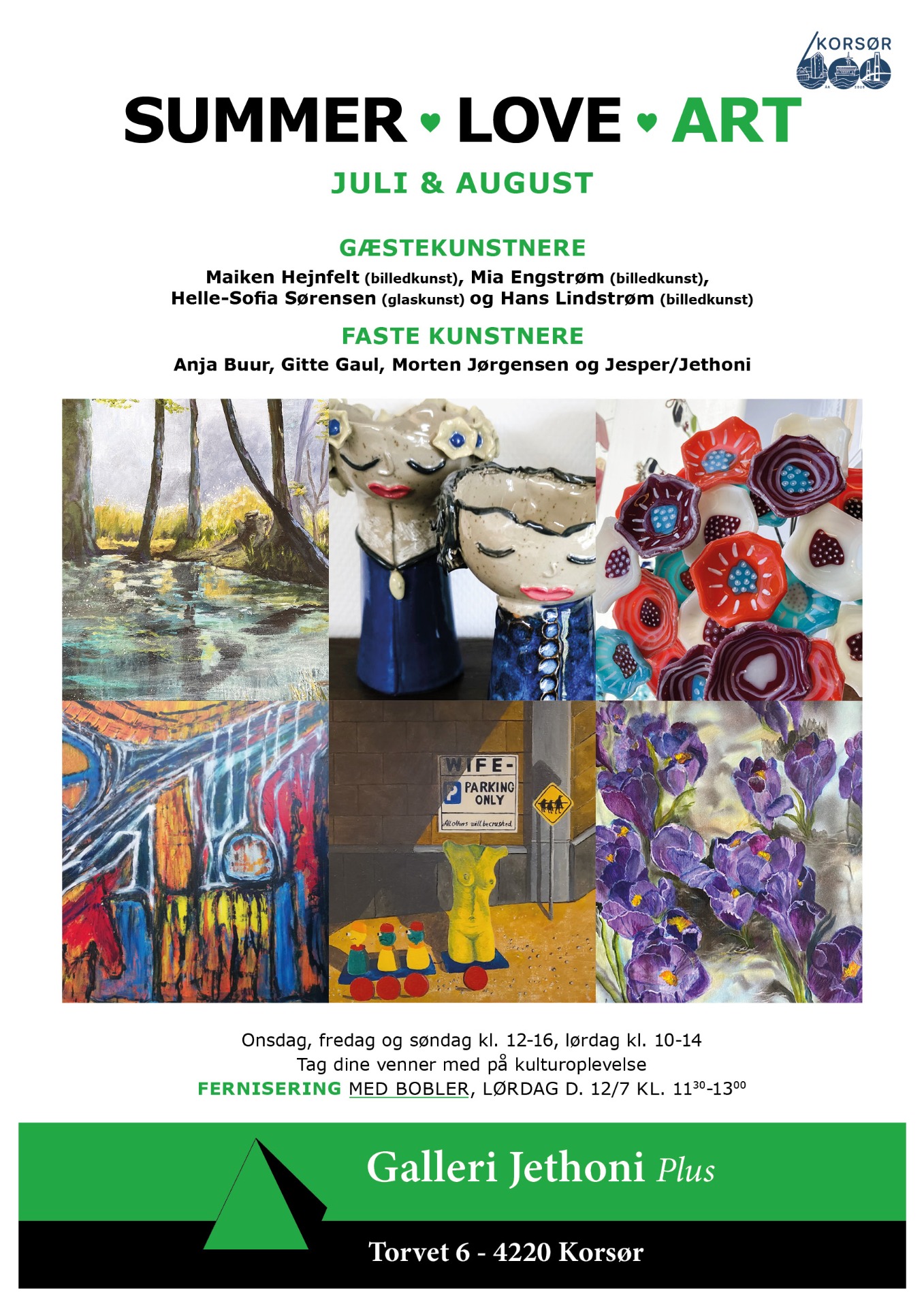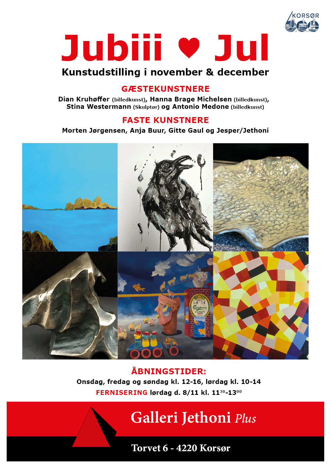 I anledning af Korsørs 600-års jubilæum har Galleri Jethoni Plus på Torvet valgt at arrangere en udstilling for publikum i november og december, hvor vi hylder det sensible, det skrøbelige, sindet, virketrangen, drømmen, proaktiviteten og glæden og julen, som jo er på vej. Titlen er Jubii / Jul.